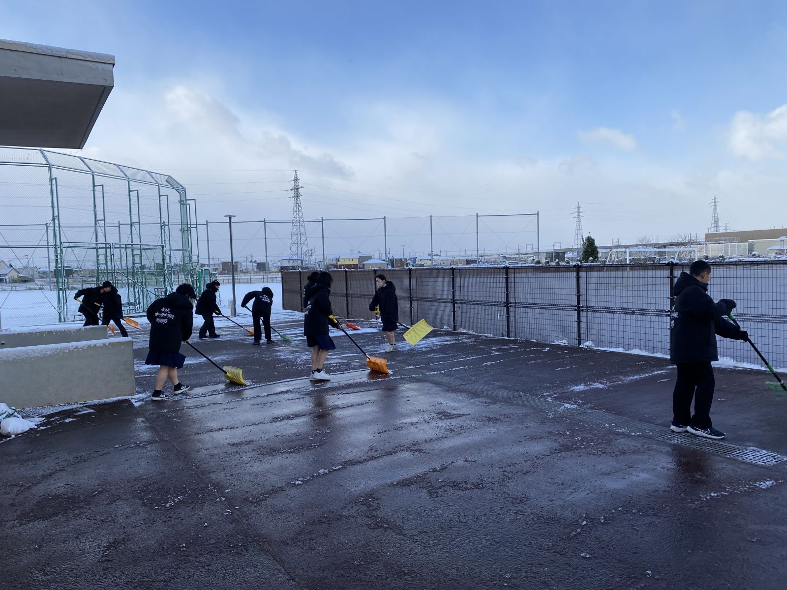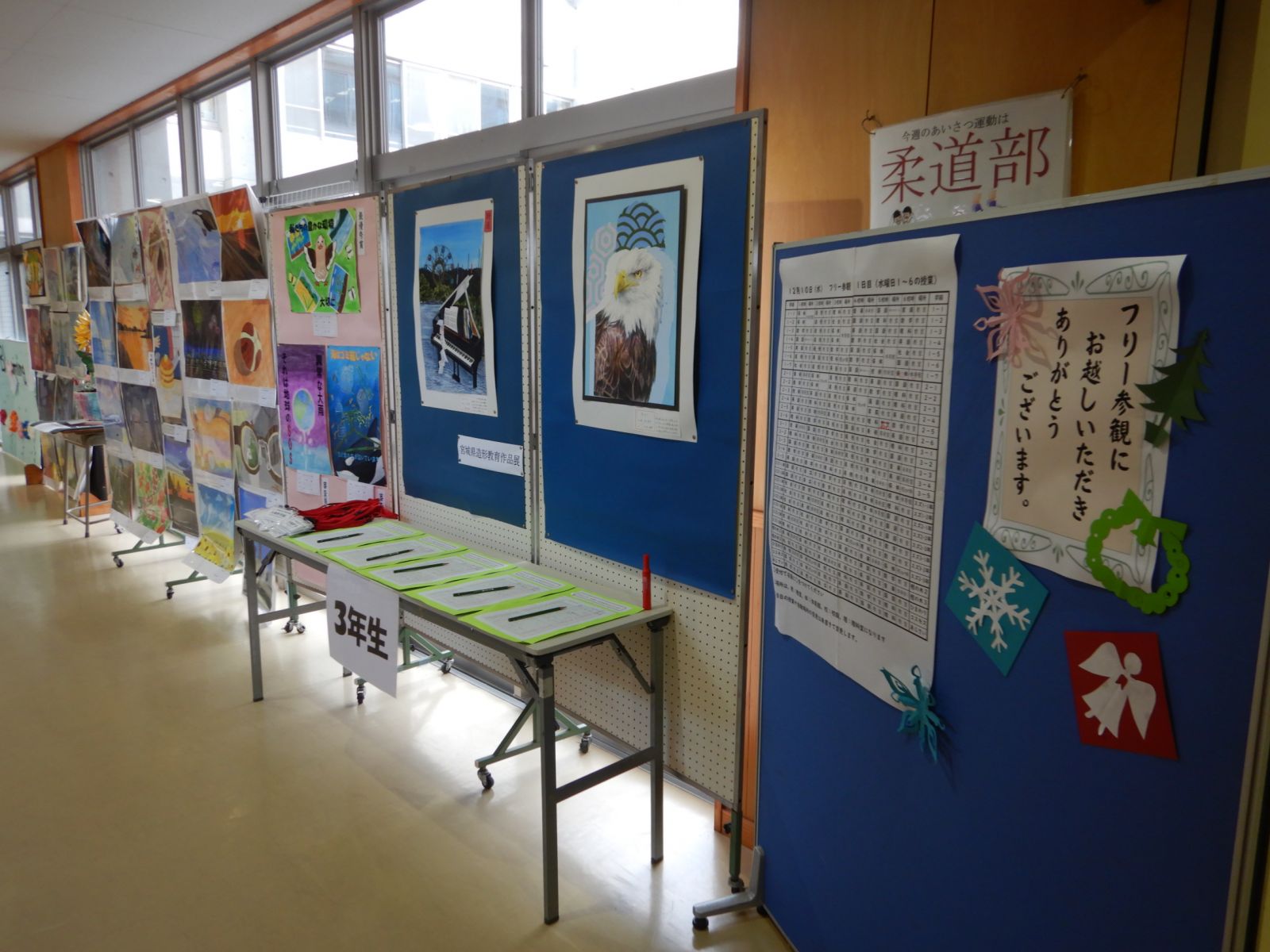 ※写真はフリー参観において,美術部が作成した装飾と朝の登校時に雪かきを行う剣道部の様子です。