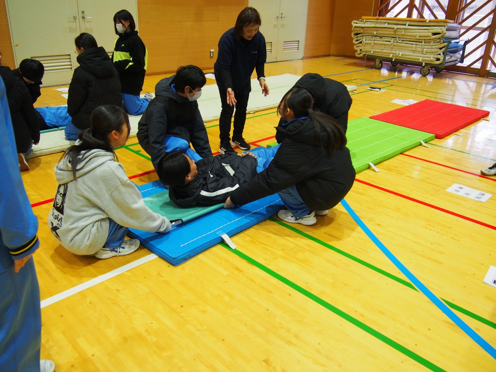 1年生は「防災クロスロード」を行いました。与えられたお題に対して、YES・NOのカードを提示し、自分の意見や考えをグループ内で共有し合いました。2年生は、仙台大学健康福祉学科の先生方を講師にお招きし、「心肺蘇生法・AED訓練、車椅子体験、担架での搬送訓練」を行いました。保健体育の授業で学んだ知識を生かし、ダミー人形を用いて心肺蘇生法やAEDの使用手順を確認しました。3年生は「避難所運営ゲーム(HUG)」を行いました。学校に避難者が避難してきた際の対応について、様々な視点で意見を出しながらグループ内で机上訓練に取り組みました。