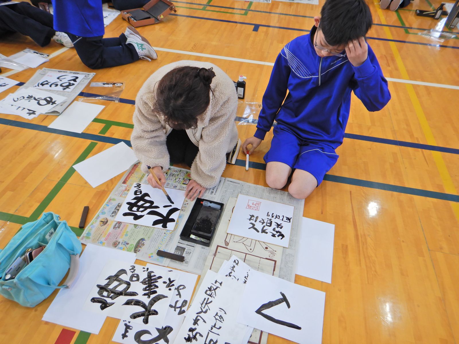 国語科の書写で学ぶ技能とは異なる筆の使い方で、味わいのある文字を書くことにチャレンジです。どういう言葉を選ぶかによって、そこに込められるメッセージの趣も変わります。