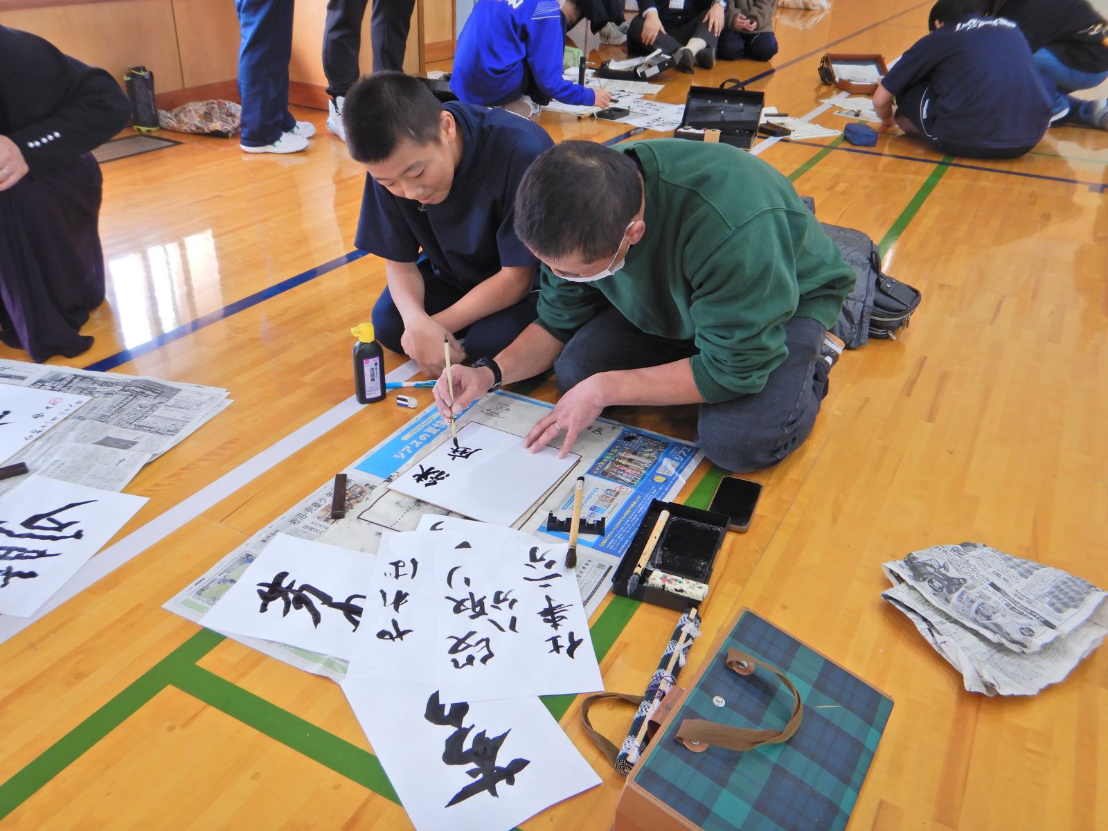 講師に筆師 志楽(しらく)氏を招き、色紙に墨と筆を使って自由に文字を書き、それを家族に贈ろうというテーマで活動しました。