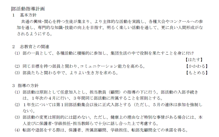 本校としての部活動のねらい、ハイシーズンの定義、ハイシーズンにおける平日の時間延長または休日の例外的実施に係る運用方法、定期考査前等に全部活動が原則的に休止となる期間等を明確に示します。