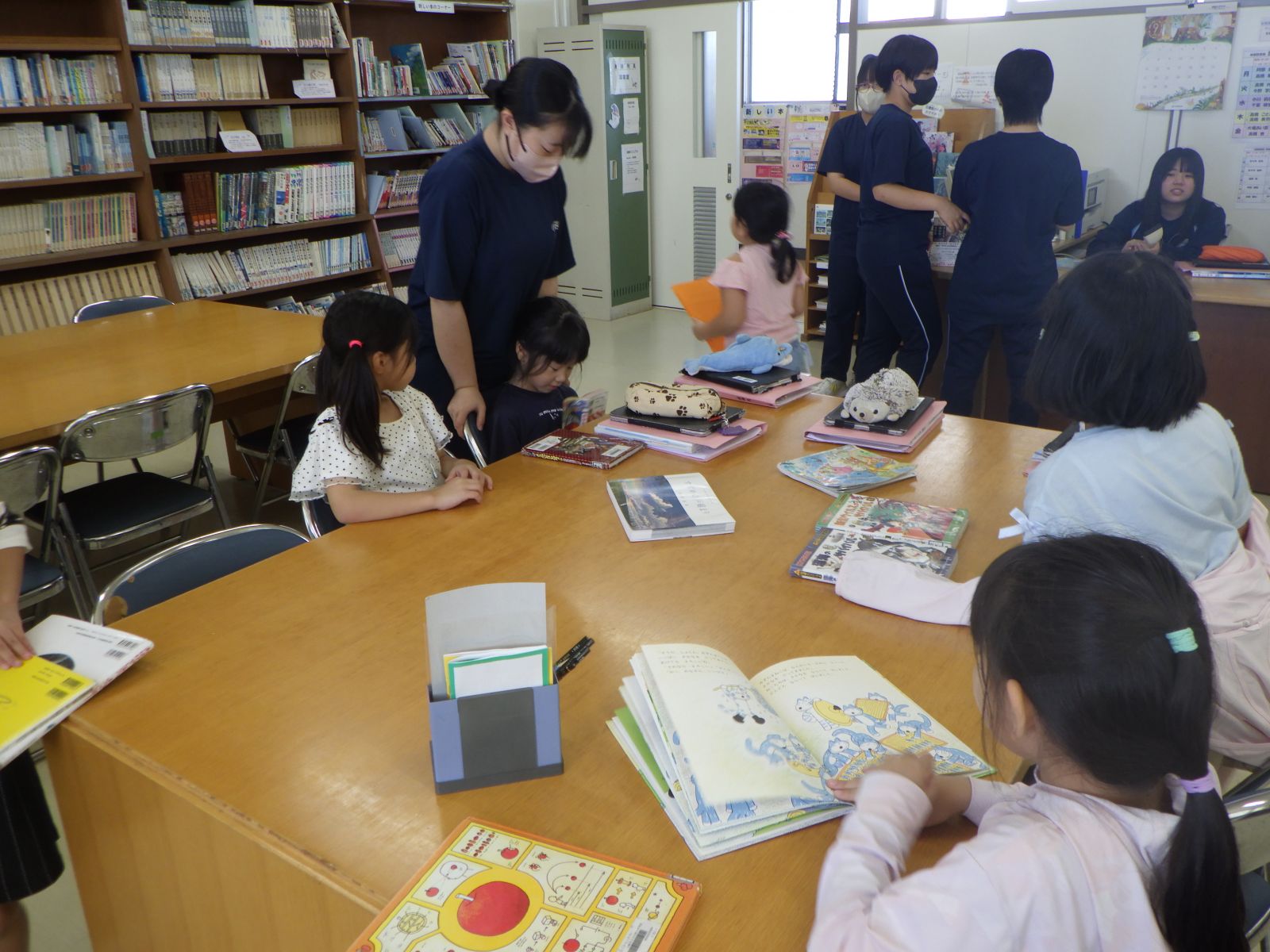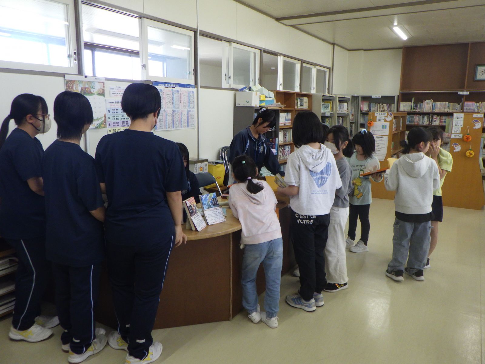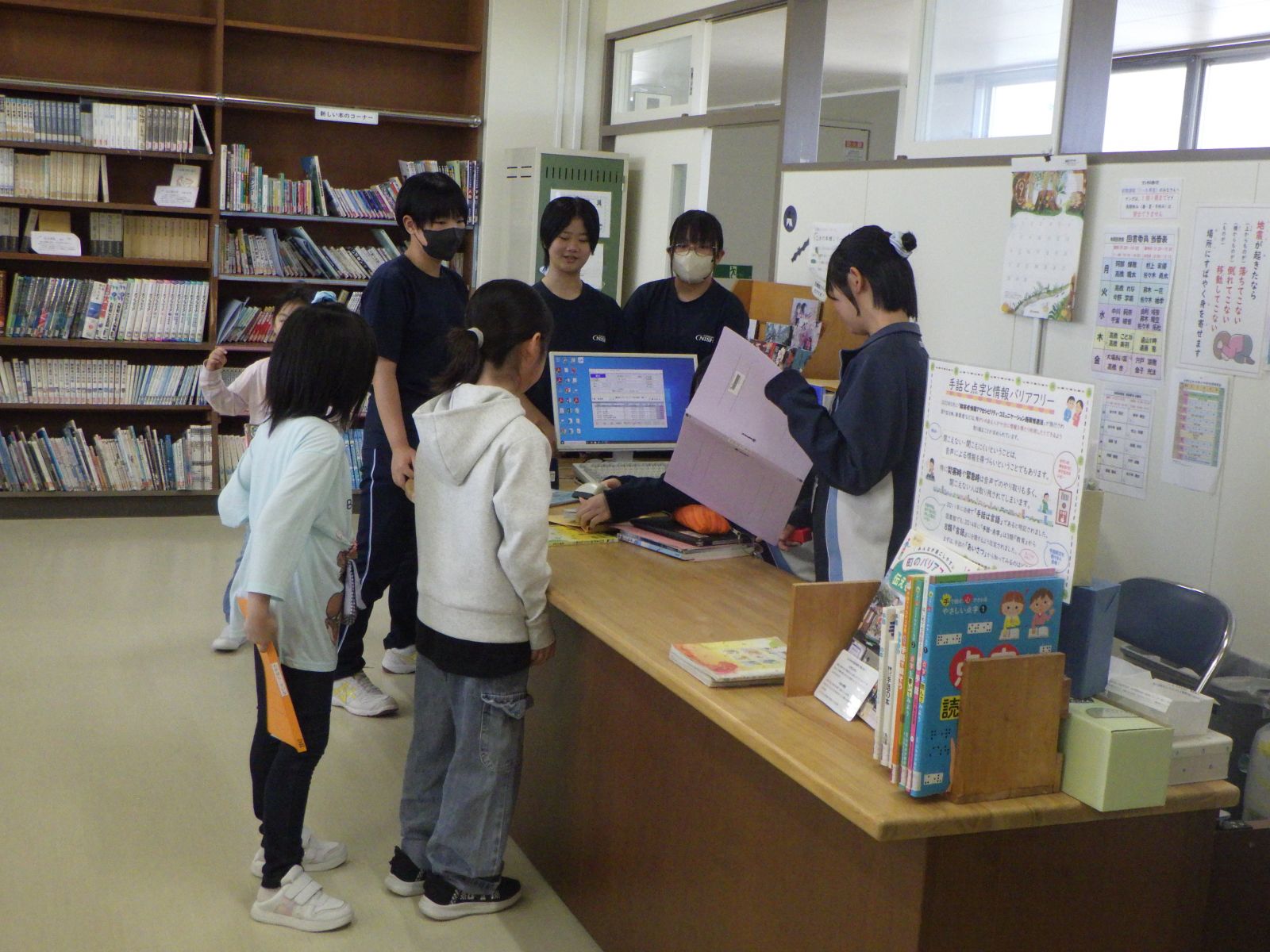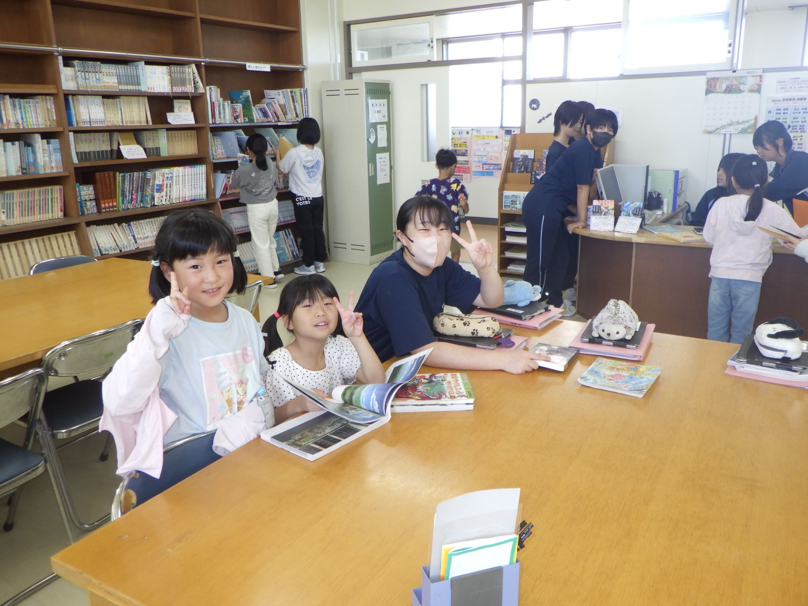 業間休みの時間に、図書室で、前期課程の児童と後期課程の生徒が交流する様子が見られました。