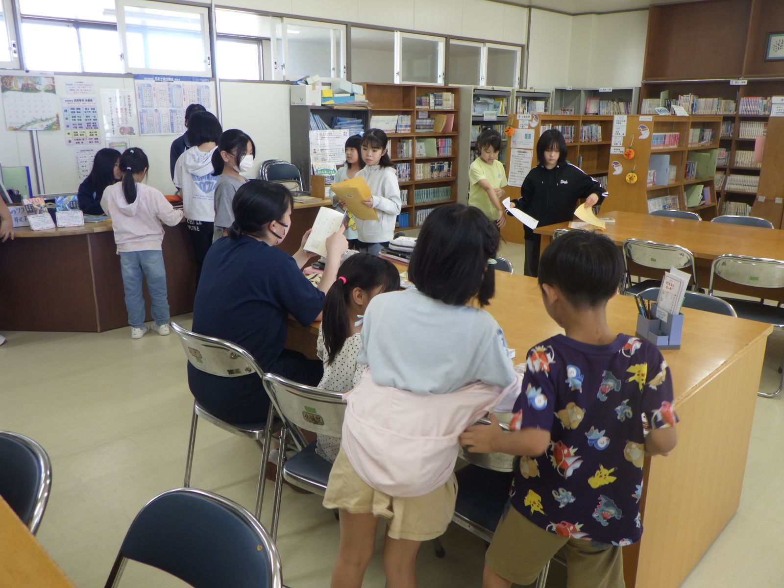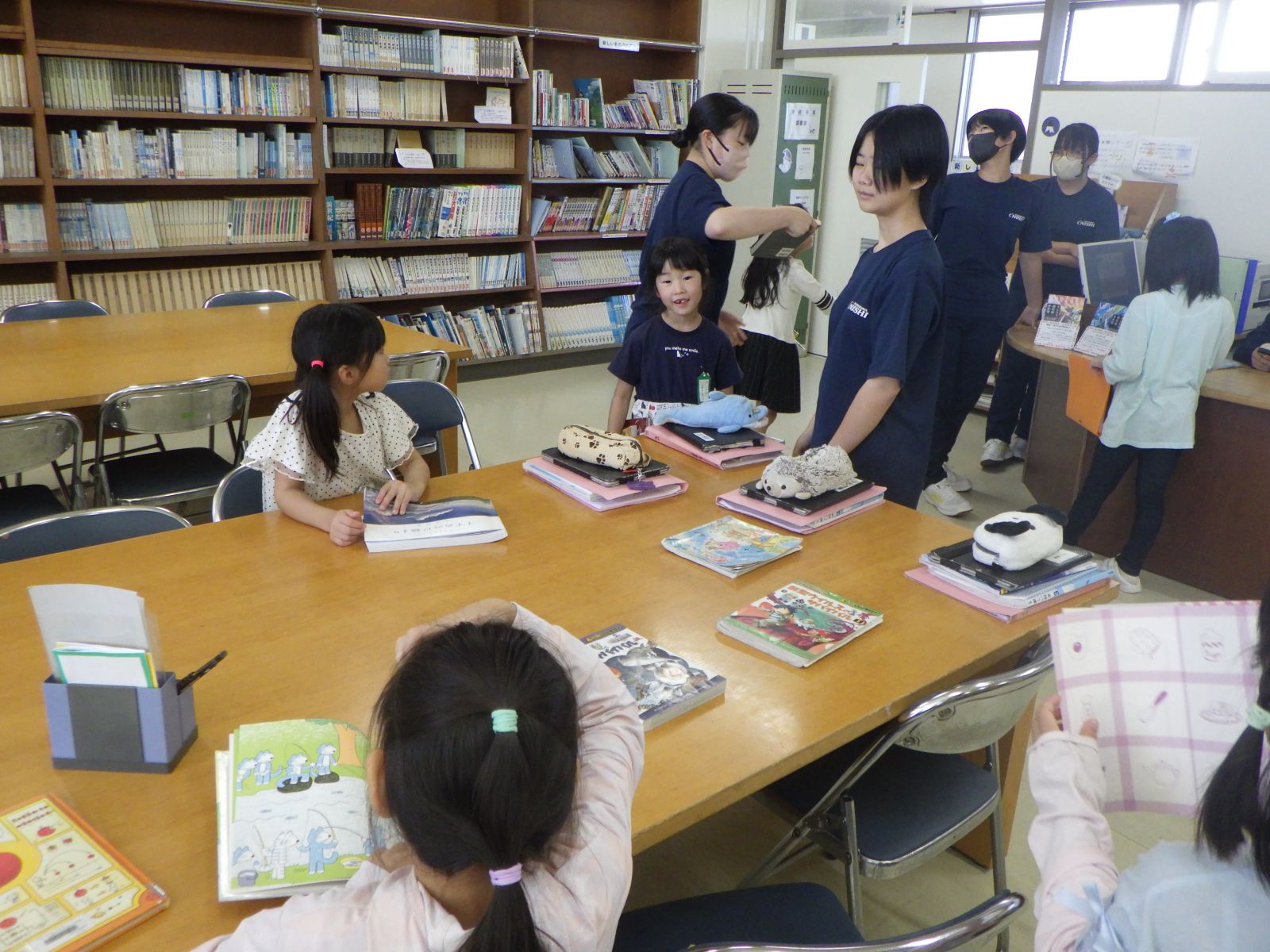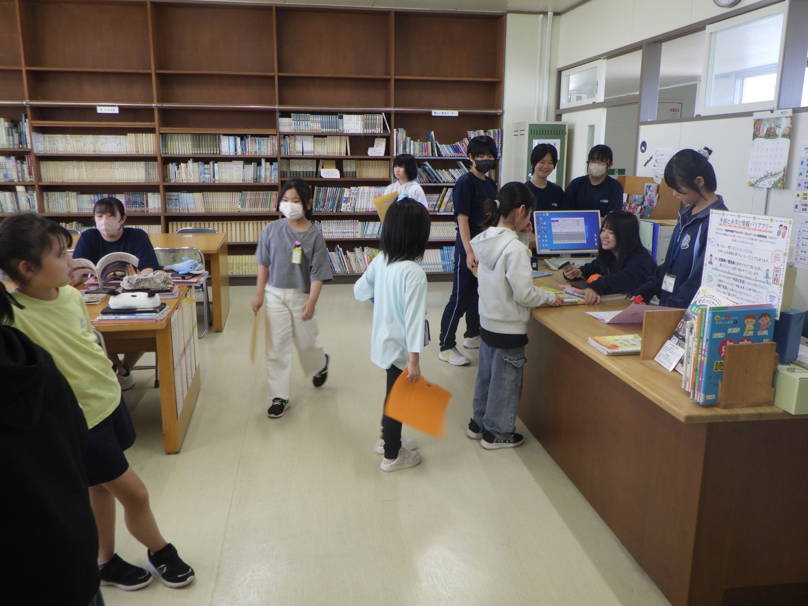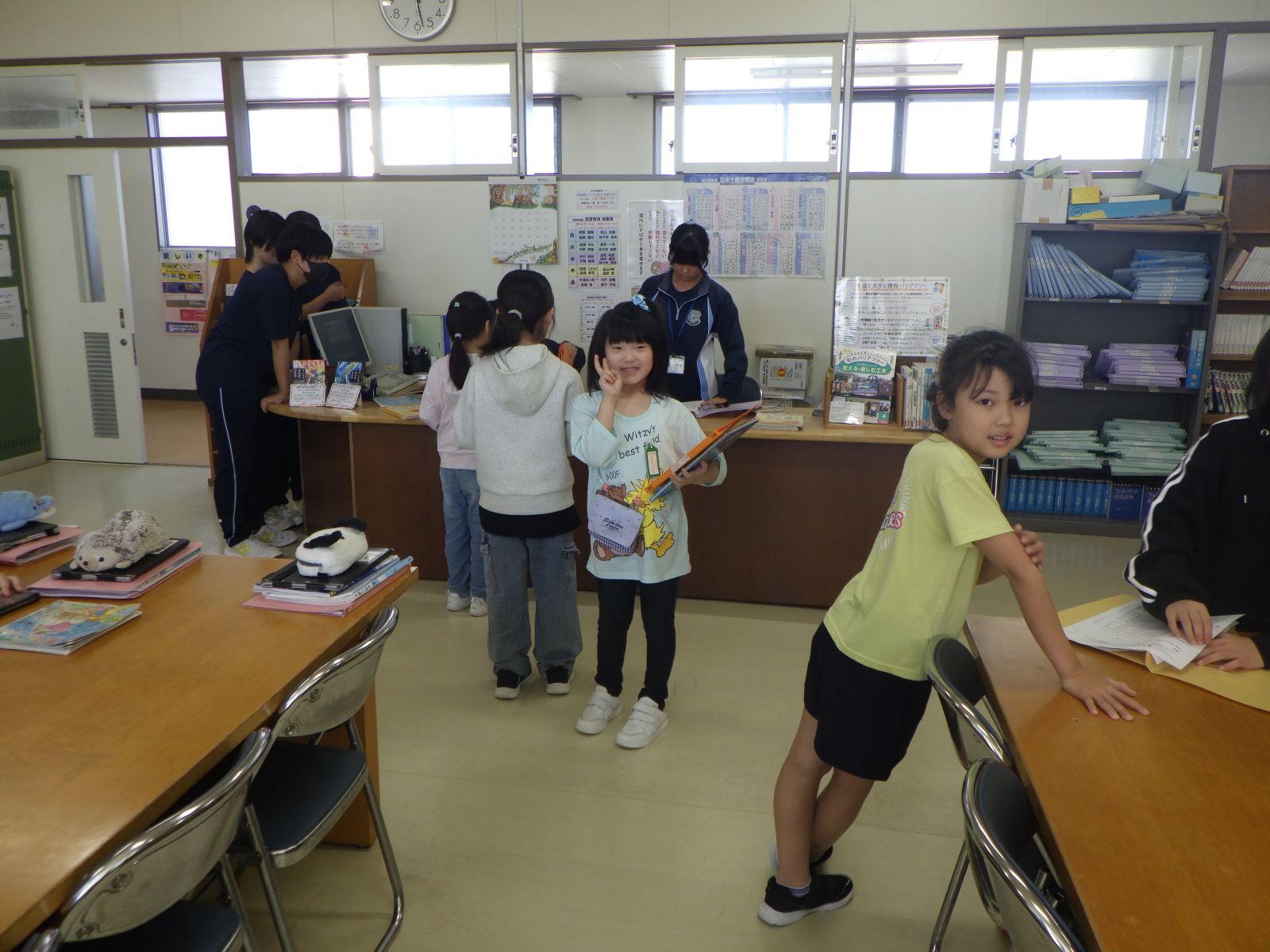業間休みの時間に、図書室で、前期課程の児童と後期課程の生徒が交流する様子が見られました。
