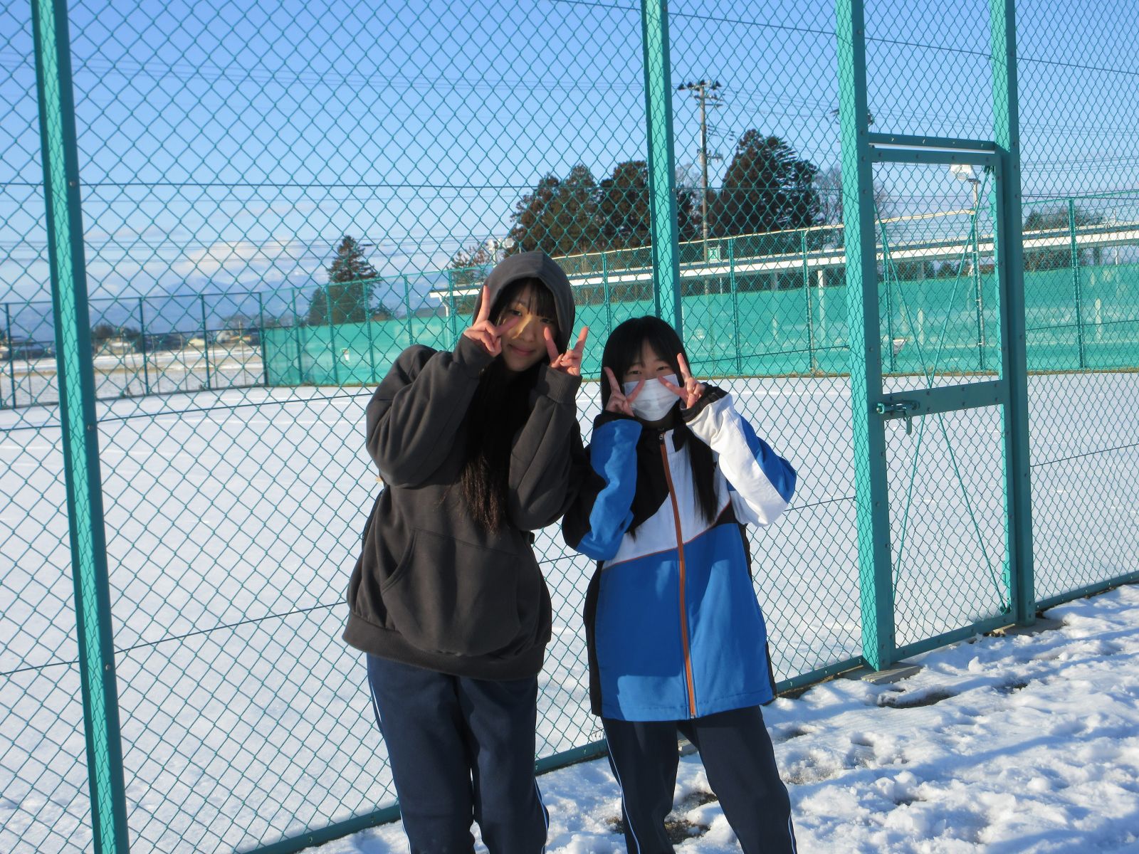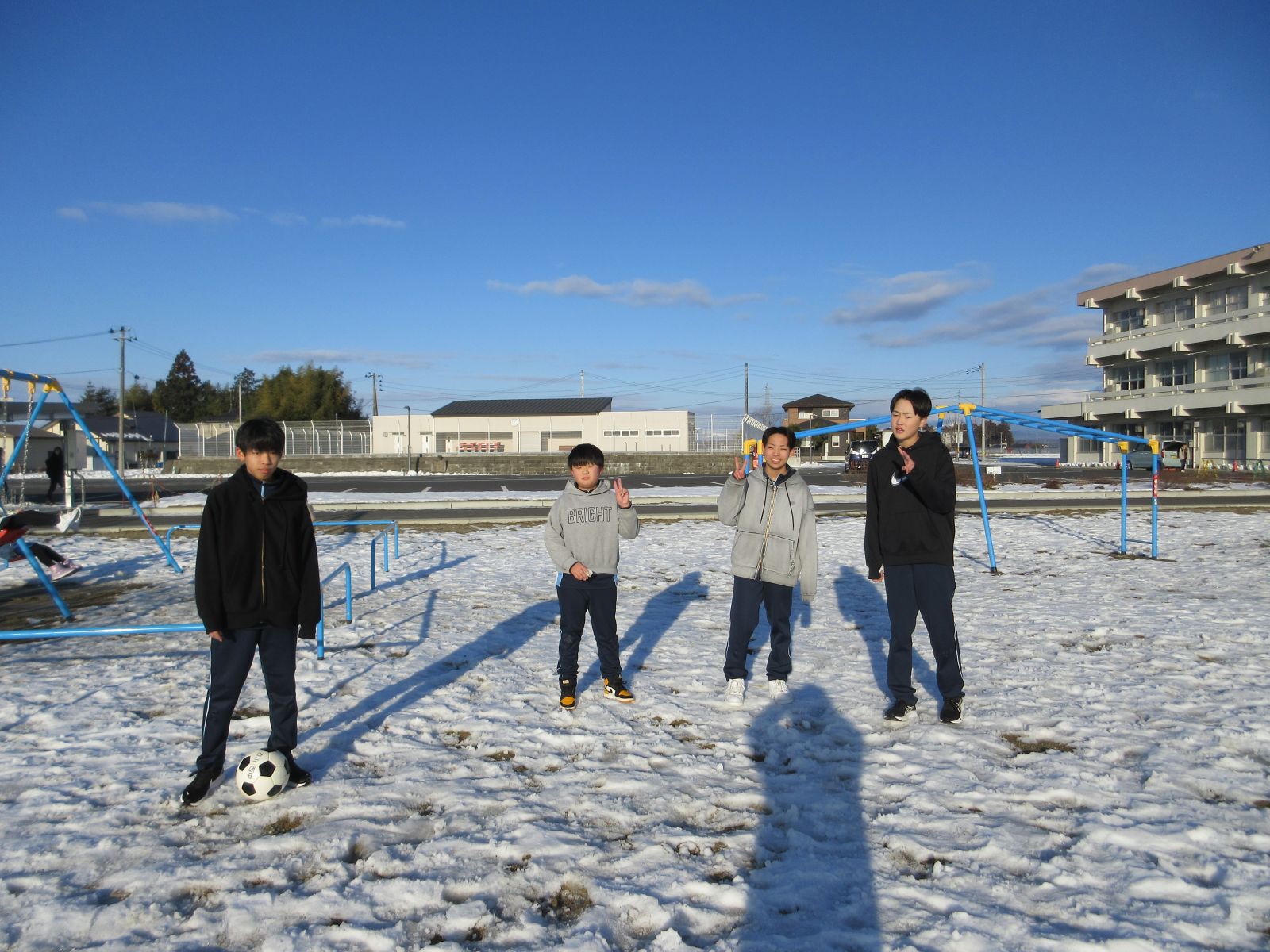 まだ雪が残る校庭で、子供たちは元気に過ごしています。