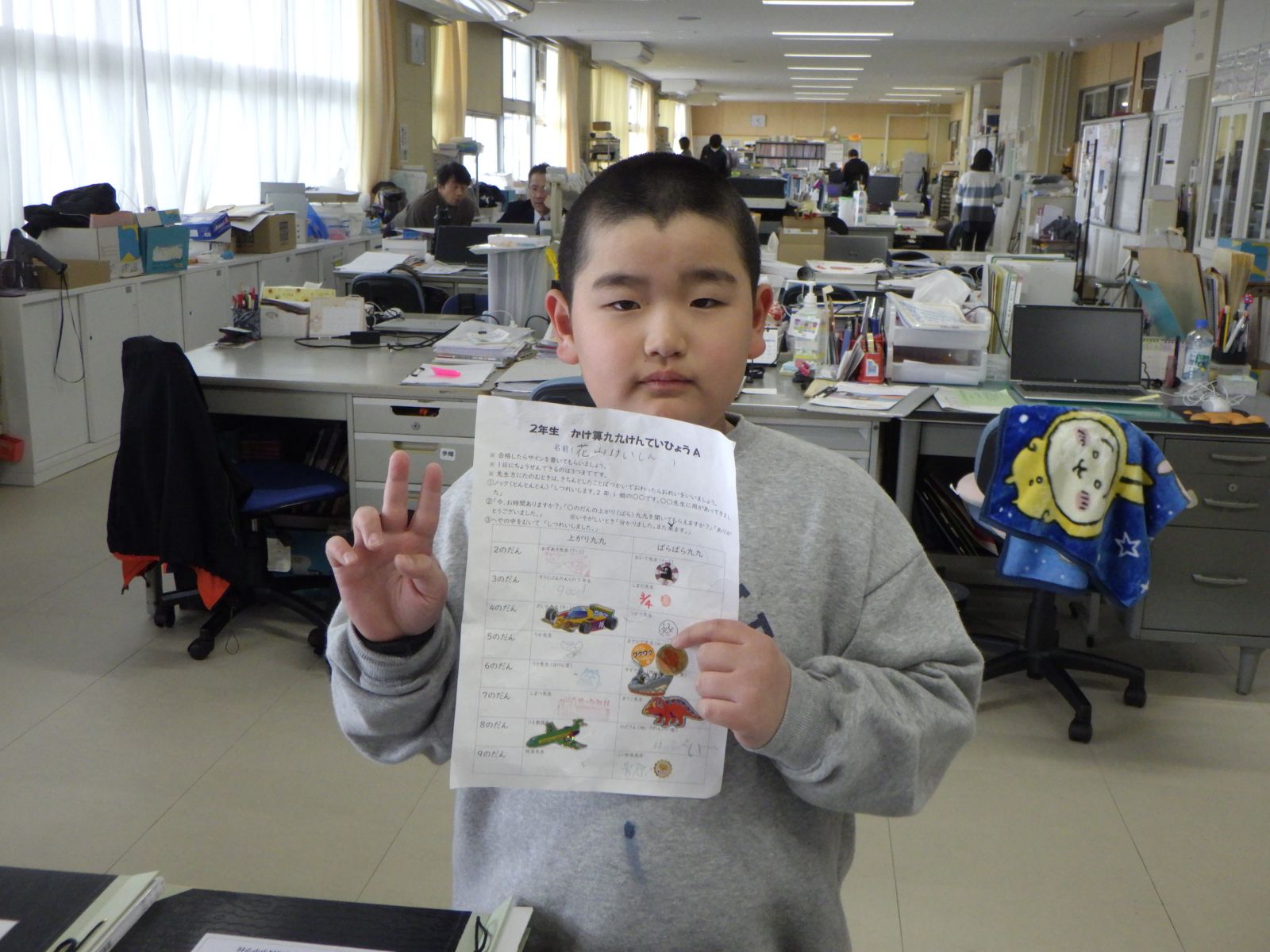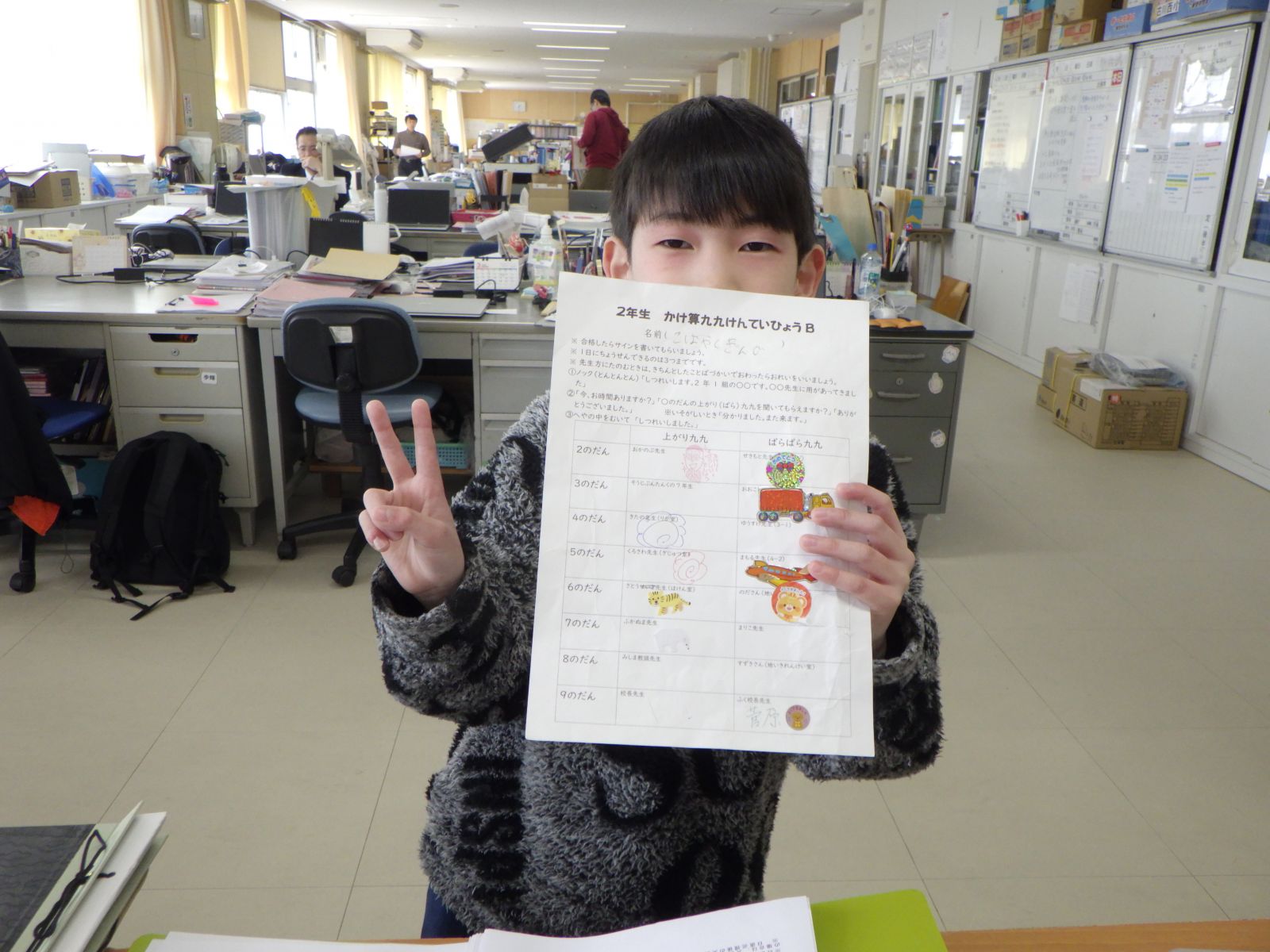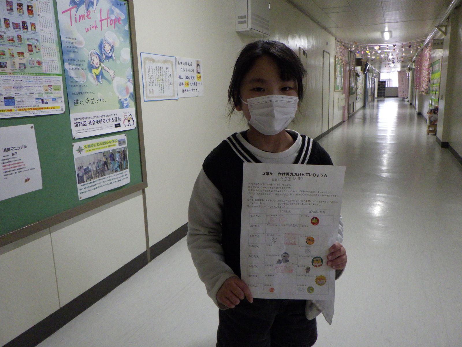 廊下で、いろいろな先生に九九を聞いてもらっています。
