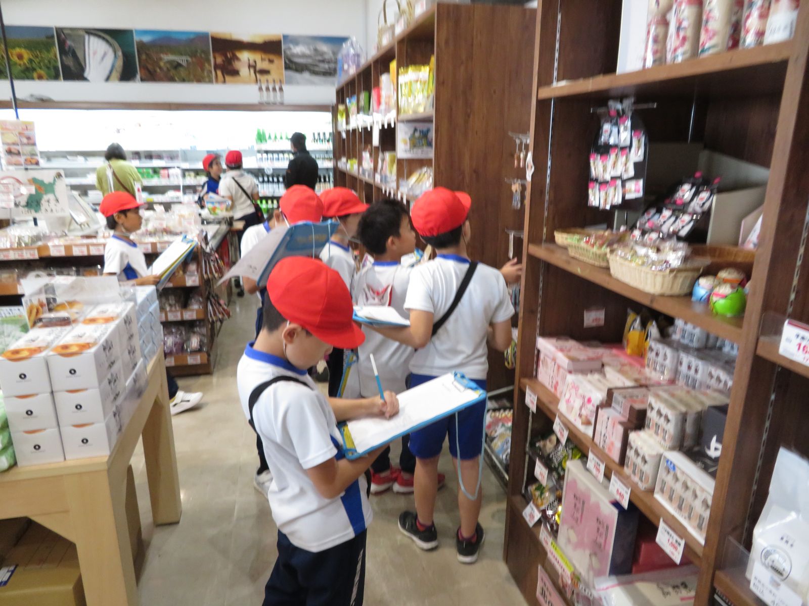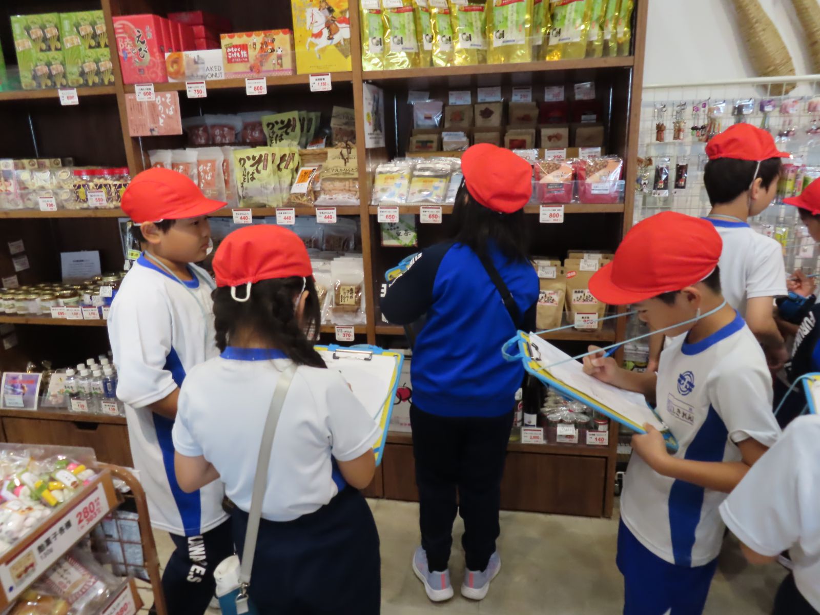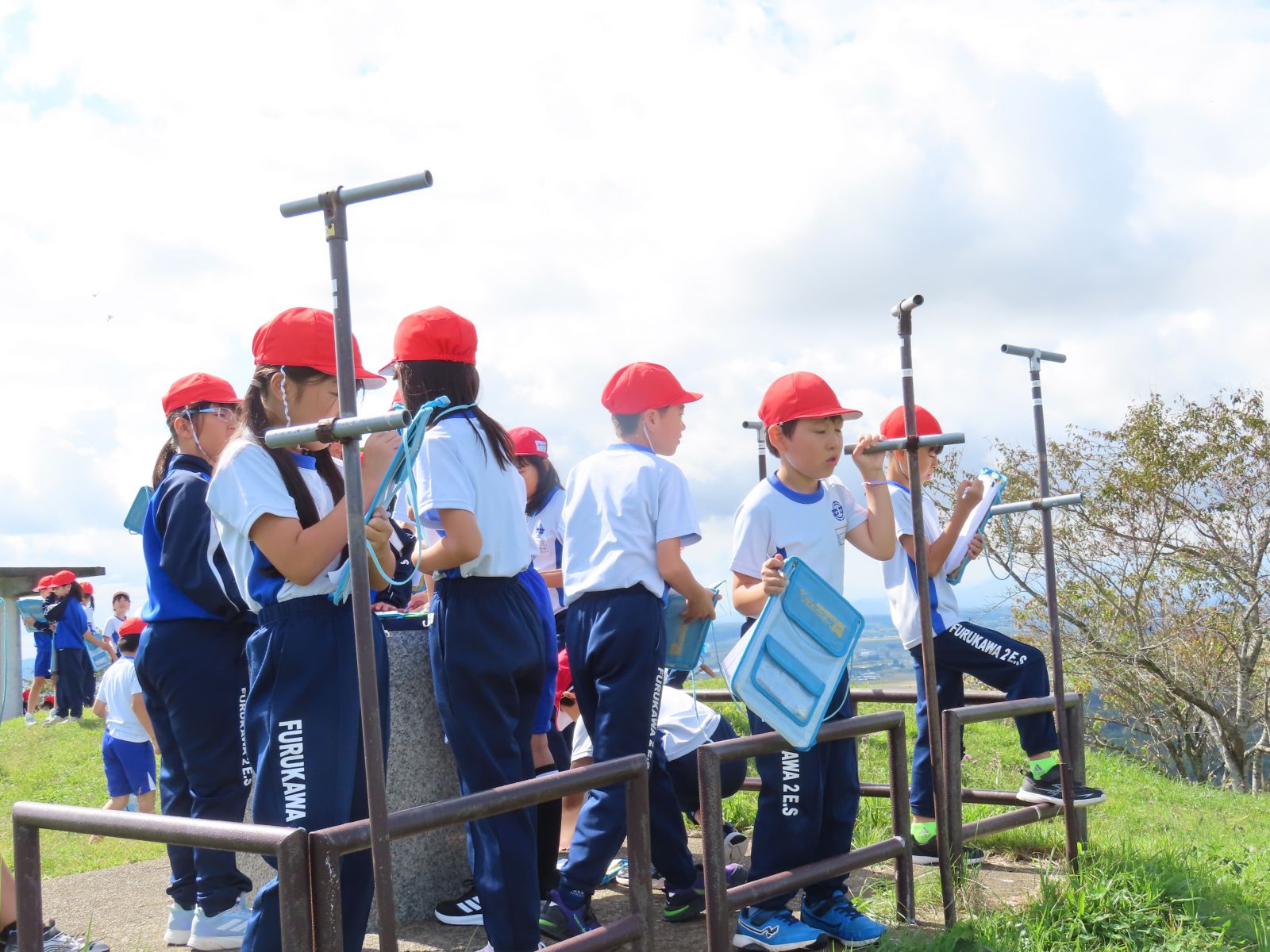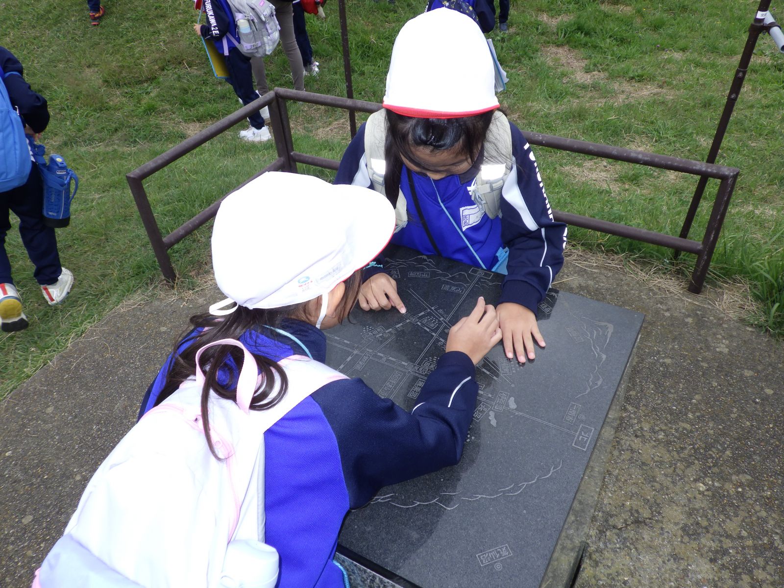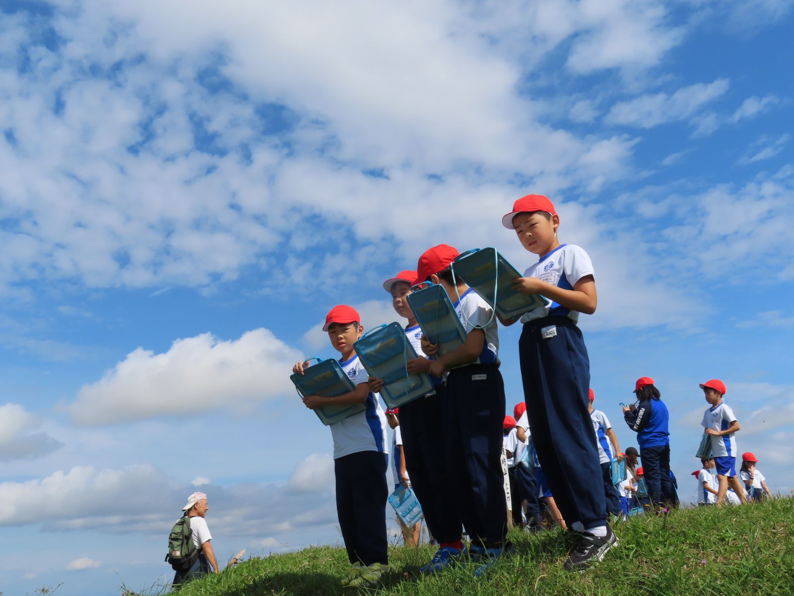がりや学校の方面を確認する子供もいました。草の上
