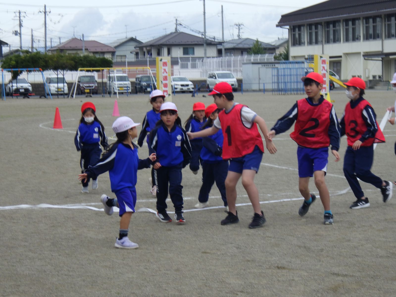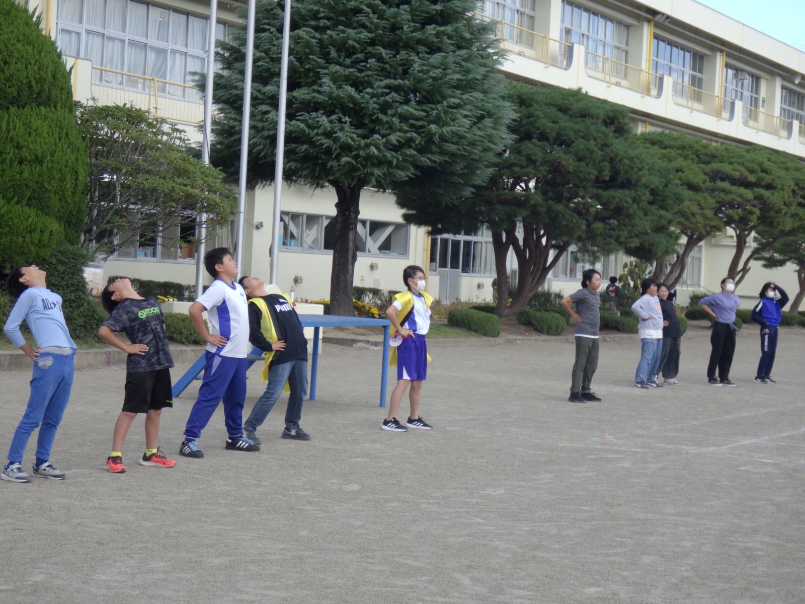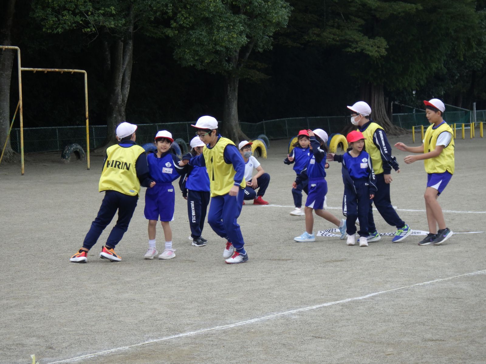 総練習の徒競走で審判の係児童が仕事をしているところです。