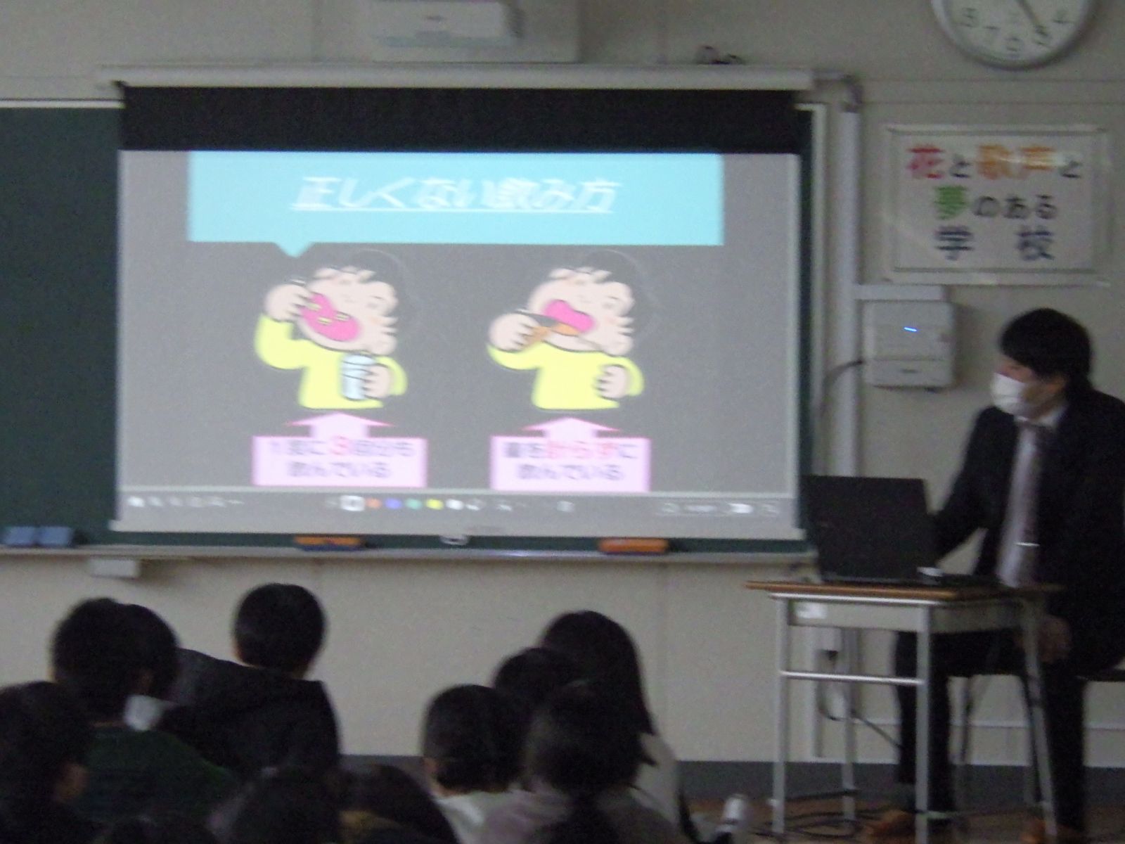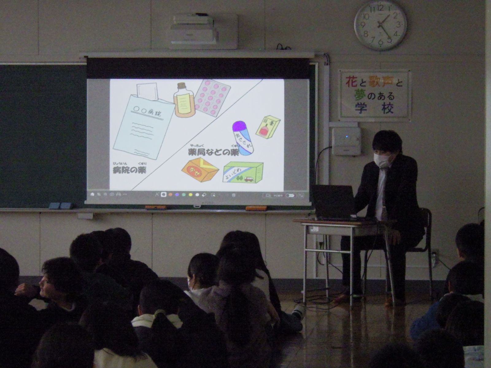 学校薬剤師の佐藤さんが,スライドを使いながら,
