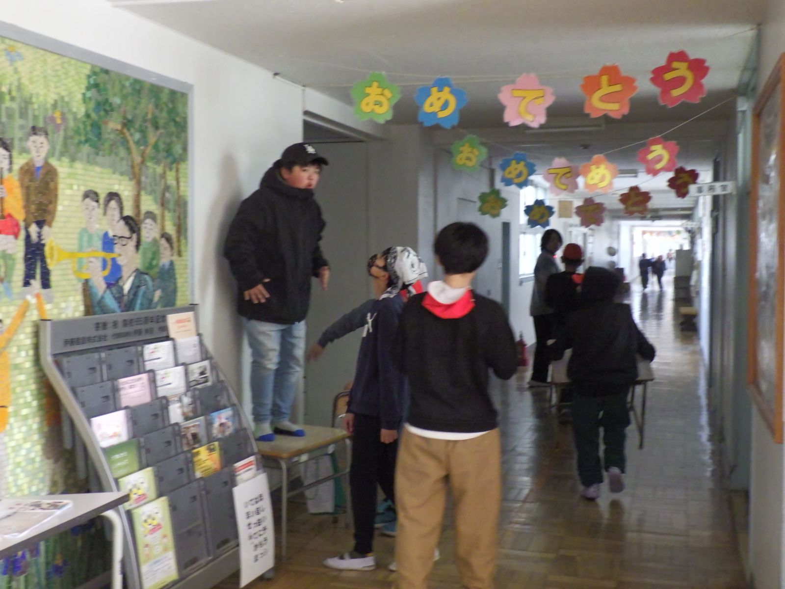 廊下の「おめでとう」カードの飾り付けを頑張ってい