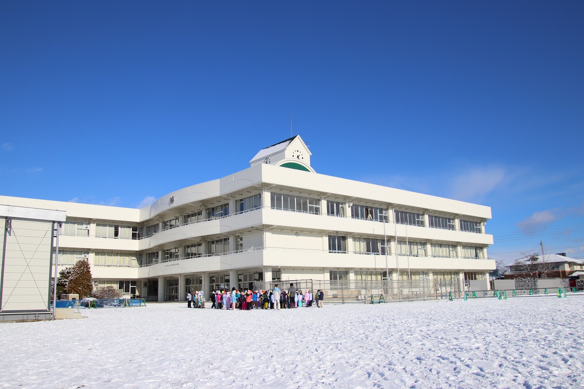 今日は雪が積もったため、1年生が雪遊びを楽しんでいました。真っ青な空の下、みんな元気いっぱい遊びました。