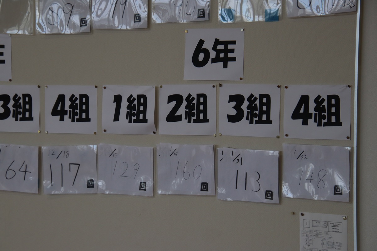 学級ごとに跳んだ回数を、ホールに掲示しています。