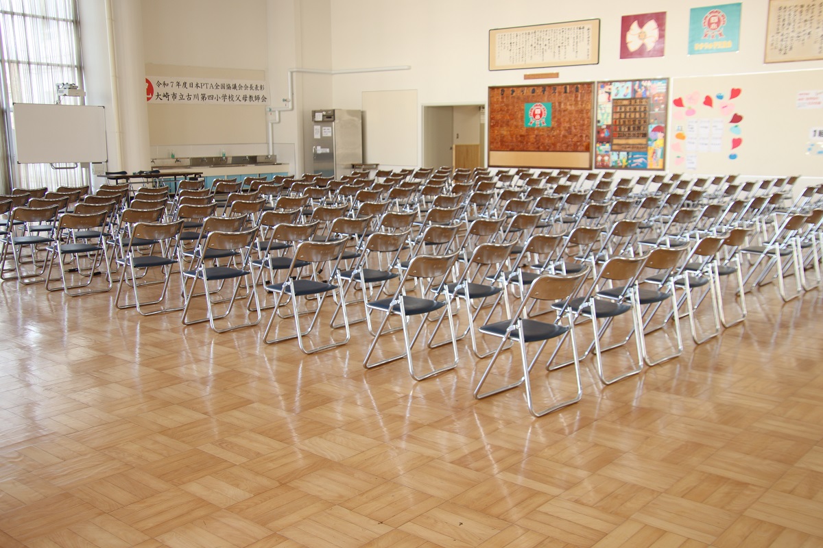 会場は、6年生が椅子を並べてくれました。あっという間に100脚ほどのパイプ椅子を整然と並べてくれました。さすが最高学年、6年生です。