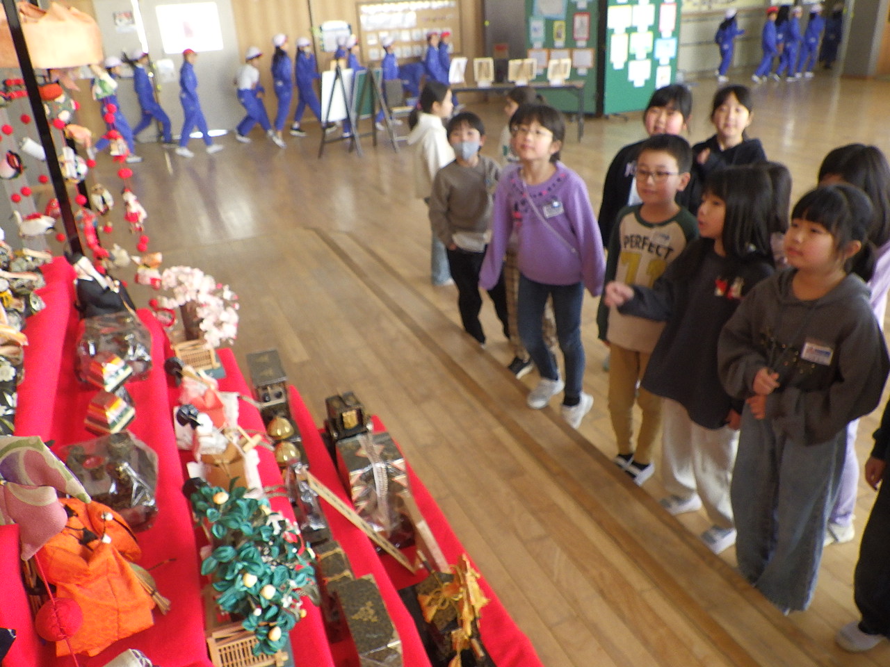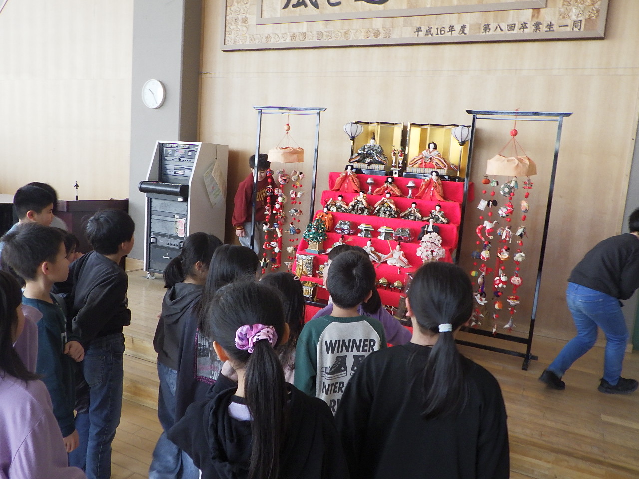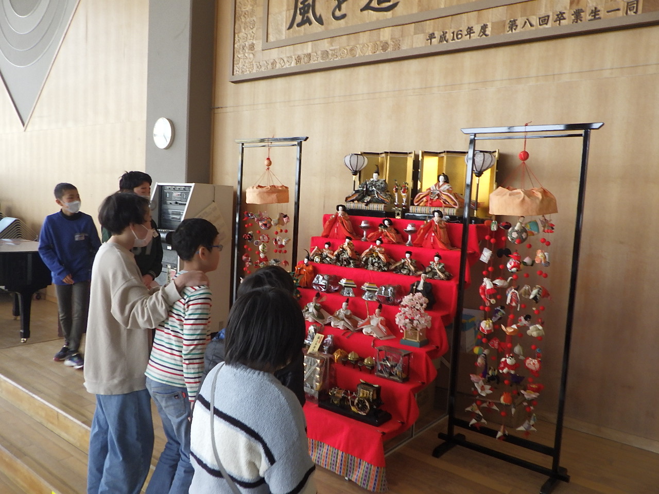 展示されているのは、伝統的な七段飾りと、細やかな細工が可愛らしい2脚のつるし雛です。 休み時間には、足を止めて「お雛様、きれいだね」「こっちのお道具は何かな?」と興味深く眺める子供たちの姿が見られ、校内は一足早い春の訪れに包まれています。