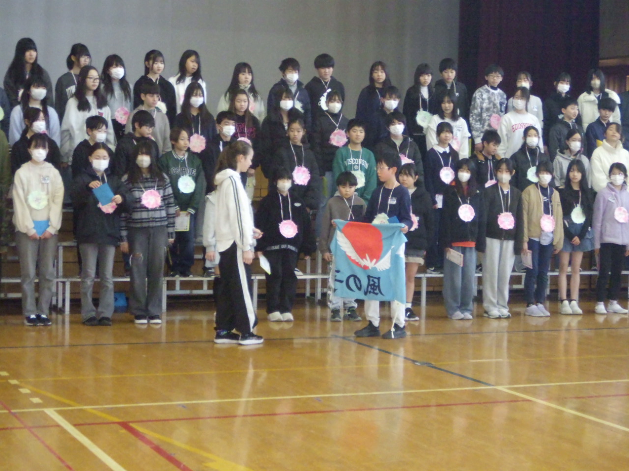 会場は、3年生と4年生が心を込めて飾り付けた階段を通り、5年生が華やかに彩った体育館へと続きました。4年生が掲げる色鮮やかな花のアーチをくぐり、6年生が照れくさそうに、しかし誇らしげな表情で入場し、温かい拍手の中で会が幕を開けました。