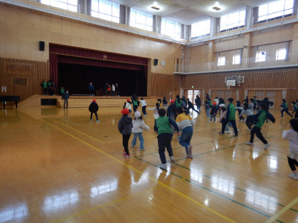 生活委員会で話し合い、寒くてもみんなで体を動かして遊ぼうと「だるまさんがころんだ」を企画しました。今日1月28日(水)から2月20日(金)までの毎週水曜日と金曜日の行間休みに実施します。今日の1回目は、たくさんの子供たちが体育館に集まりました。大規模な「だるまさんがころんだ」でも、ルールを守ってみんなで楽しく活動できました。