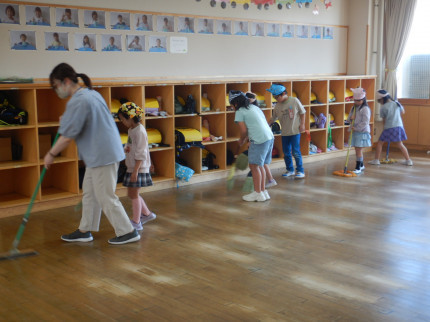 1年生の掃除時間,先生の後ろに並んでほうきで掃く姿がかわいいです。雑巾で拭く子たちと,机を運ぶ子たちは,静かに床に体育座りして待っています。1年生の掃除の決まりをしっかり守って,黙働清掃に取り組んでいます。