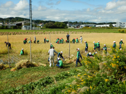 5年生の総合的な学習の一環で,本日,稲刈り体験をしました。子供たちは初めての体験で,最初は慣れない手つきでしたが,次第にコツをつかみ,上手に稲を刈ることができました。青年部の皆様,ご指導ありがとうございました。