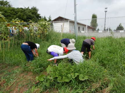 夏休みが明けて2日目,コスモス学級の子供たち全員で,学級で育てているさつまいも畑の除草作業を行いました。夏休み中に生い茂った雑草の多さに驚きながら,みんなで一生懸命に草を取りました。さつまいもが順調に育っていることも確認できました。