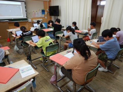 3年生の授業の一コマです。総合的な学習の時間で,「みんなで生きる社会」の学習(福祉)で調べ学習をしていました。夏休み前にキャップハンディ体験や白杖体験など行い,そこから課題を見付けて調べています。みんなとても真剣です。