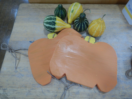 社会福祉協議会・結の会の皆様からハロウィンオーナメントをいただきました。今年で3年目になります。毎年,結の会の皆様が木の板をカボチャの形に切ったオーナメントを作り,6年生が記念に持ち帰れるようにといただいています。いただいたオーナメントにハロウィンらしい絵を描いて校庭に飾る予定です。