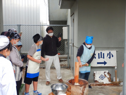 12月11日,5年生が餅つき体験をしました。5年生は,総合的学習の時間で1年を通して稲作について学習してきました。今日は,その集大成として,学年PTA行事と併せて収穫したもち米でもちつき体験をしました。