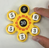 画像を見てください。黒と白のサイコロがありますね。白のサイコロ「5」「5」「2」「3」「6」の数を使って計算して,黒のサイコロの数を足した「35」を作れれば成功です。
