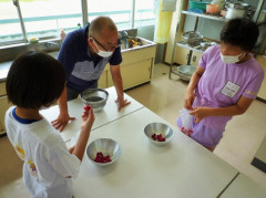 家庭科室で,収穫したものをきれいに洗い,家庭に持ち帰るように分けていました。