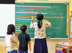 意欲的にたくさんの「長さ」を測って来る子供たちに,学級担任も大忙しです。“どこの長さ?”と確認して子供たちの表現を引き出したり,高さや縦,横をイメージできるように言葉を伝えたりしながら,黒板に貼り付けていました。