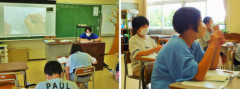 子供たちが考え出した方法で,教員が実際に書いて投影しながら確認します。子供たちは真剣にスクリーンを見つめ,“なるほど”という表情も見せて学んでいました。