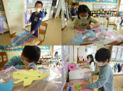 1年生が図画工作の時間に,風が吹くとひらひら揺れるオブジェを作っています。