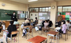 古川西中学校の笹川校長が,3時間目からの“乗り入れ授業”を視察するために来校しました。