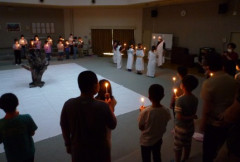 花山合宿2日目の夜,5年生が,一緒に参加している西中校区内の3小学校の子供たちとキャンドルサービスを行って交流しました。
