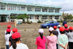 自動車学校の方々からは,実際に校庭で自動車を走らせてもらい,交通事故から身を守る方法を示していただきました。