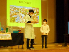 らんま先生は独楽を上手に操ったり,ヨード液入りの水を一瞬で透明にしたりして見せながら,科学や環境のお話をしてくださいました。エコロジーについても,深く考えるきっかけを与えてくださいました。