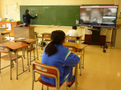 自宅待機児童には,板書や他の子供たちの学習の姿を配信する「リモート授業」を行っています。