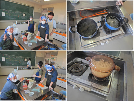 家庭科室から懐かしいご飯のお焦げの匂いが漂っていました。今日は5年生の調理実習の日です。ご飯とお味噌汁を作りました。お味噌汁は、きちんと昆布や煮干しから出しを取ってのなめこ汁です。野菜のいちょう切りもきちんとできていました。男子3人+男性教員の男の手料理です!
