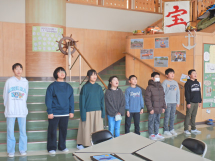 田んぼの活動でお世話になった方にお出でいただき、感謝の思いを伝えるとともに収穫したお米でおにぎりをつくりみんなで味わいました。また、保護者の皆様には豚汁をつくっていただくなど、おいしい顔と笑顔があふれる会となりました。感謝の気持ちを込めた8人の優しい歌声がホールに響き渡るなど、最後の会にふさわしいすてきな会となりました。