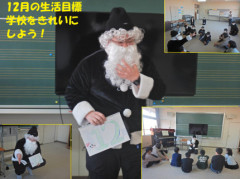 いよいよ12月に入りました。今年も1か月を残すのみです。なんと!朝会をしていると、ブラックサンタさんが登場です!ブラックサンタさんからは、12月の生活目標についての話がありました。赤いサンタさんじゃないのは、きっと一足先に大掃除を頑張っていたからでしょう!子供たちに「学校をきれいにしよう!」と呼びかけて消え去りました・・・。楽しく、笑顔で1日がスタートしました!