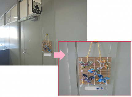 9/5 校長室のドアは鉄製のやや無機質な感じのする素材です(とても頑丈でよいのですが)。そんなドアの横に、ある作品が飾られていて、ドアに彩りを与えてくれています。これは、ご近所にお住まいの方にいただいたもののようです。広告を上手に活用した作品でかわいらしい蝶が舞っています。いつお目にかかってもにこにこと染み入るような笑顔の方で、常に子供たちと教職員のことを気にかけてくださるおばあちゃんです(失礼を承知で親しみを込めて呼ばせていただきます)!子供たちも我々教職員もみんな大好きな方です!私たちの心にほんわかと優しさを届けてくださる方の作品!よって、ここに下伊場野小遺産に認定します!