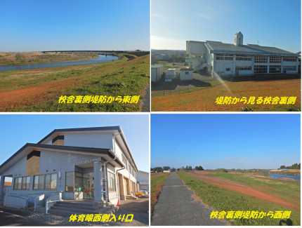 木々の紅葉が進んでいます。毎日、校舎内外を巡視するのですが、今日は校舎の裏側堤防に行ってみました。学校のすぐ側には、思わず寝転びたくなるような広大な芝空間を擁する下伊場野水辺の楽校親水公園があり、四季折々の表情を見せながら悠々と流れる鳴瀬川があります。校舎裏側すぐに鳴瀬川の堤防があり、その高さは校舎2階とほぼ同程度です。表から見てもきれいな校舎ですが、堤防からの眺めも秀逸です。2階音楽室から堤防を見たときに、犬の散歩をする方と目が合うのも毎日のことです。