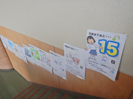 6年生を担任すると、教室に卒業する子供たちとカウントダウンカレンダーを作成し掲示することがあります。本校も卒業に向けたカウントダウンカレンダーが掲示されています。作成したのは・・・8名の子供たち全員と9名の教職員全員がそれぞれ分担して作りました。ここにも極小規模校ならではの特色があります。何をするのも一緒なのです(^^)本日、2月25日は教頭先生作成のものが掲示されていました。いよいよあと15日となりました。下伊場野小学校として最後の卒業生4名を、在校生4名と教職員全員で華やかに送り出したいと思います!